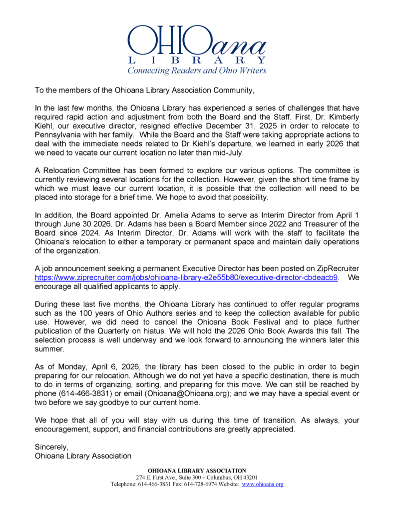 Click here to view PDF version of this announcement: https://www.ohioana.org/wp-content/uploads/2026/04/Ohioana-Recent-Developments-Jan-Mar-2026.pdf